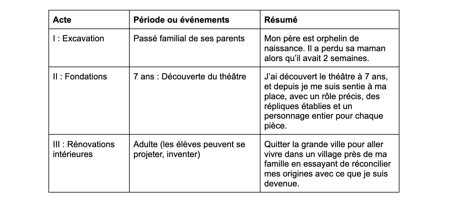 À l’image de la pièce qui est un récit de l’intime, essayer de résumer ce que serait le synopsis de votre vie actuelle et future à partir des titres des trois actes. Cet exercice se fait de manière individuelle et peut se partager sur une base volontaire ou deux par deux pour respecter la pudeur de chacun·e.
