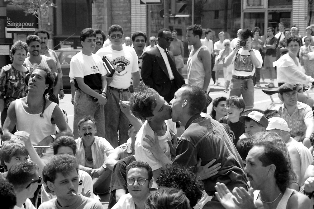 Kiss-in devant le quartier général du SPVM En réponse à la violente descente policière au Sex Garage, des militant·es organisent un kiss-in devant le quartier général du SPVM: des couples du même sexe s’embrassent publiquement pour dénoncer l’homophobie et revendiquer le droit d’exister au grand jour. Ce geste simple et audacieux — s’aimer en public — devient un symbole fort de la résistance queer à Montréal.