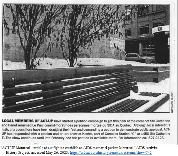 1200 rubans noirs Le premier décembre 1991, après la marche soulignant la Journée mondiale du sida, les activistes d’Act Up Montréal accrochent 1200 rubans noirs dans les arbres d’un terrain vague au coin des rues Panet et Sainte-Catherine. Ces rubans symbolisent la perte des 1200 personnes jusqu’alors décédées du sida au Québec