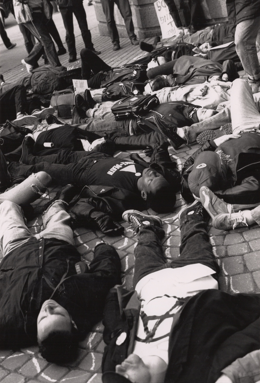 Un die-in est organisé: des corps allongés, en silence, pour dénoncer la violence et l’inaction.