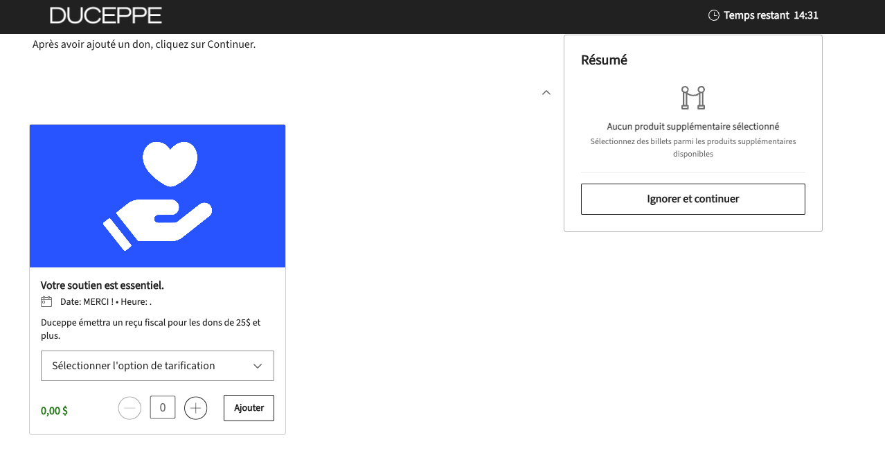 9. Vous aurez maintenant l'occasion d'ajouter un don à la Fondation Duceppe à votre achat. Sélectionnez le montant dans le menu déroulant à gauche, choisissez la quantité et cliquez sur le bouton «ajouter». Si vous ne voulez pas ajouter de don, simplement cliquer à droite sur le bouton «Ignorer et continuer».