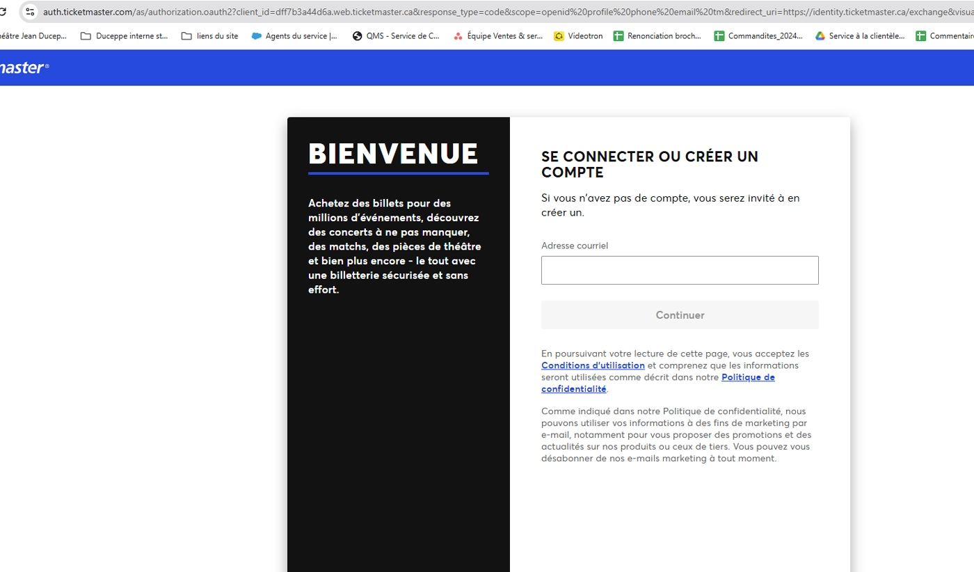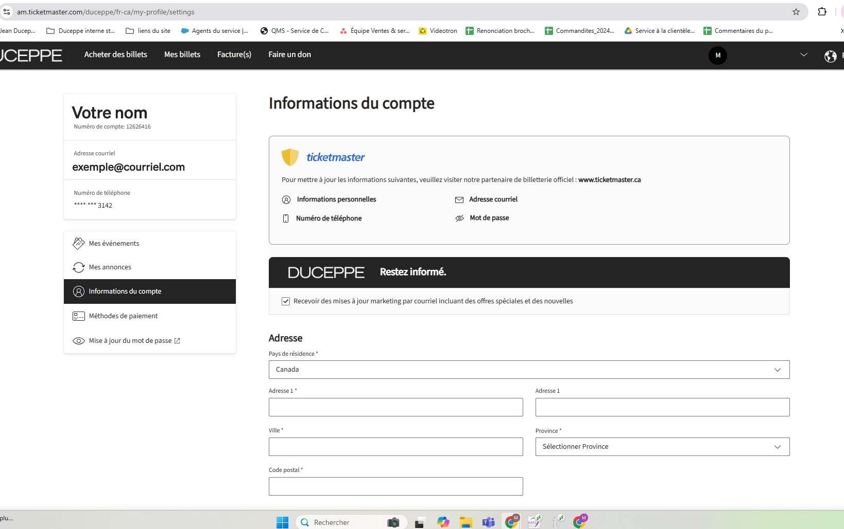 4. Pour modifier votre courriel, le numéro de téléphone associé à votre compte ou votre mot de passe cliquez sur «ticketmaster.ca». Vous serez maintenant redirigés sur le site de ticketmaster (c'est normal). Connectez-vous ensuite à ticketmaster (avec le même courriel et le même mot de passe que votre compte Duceppe).