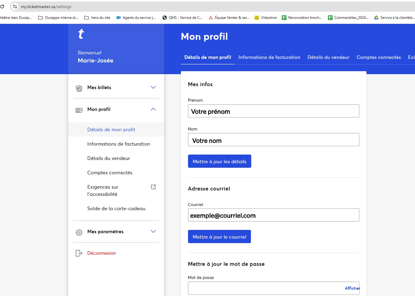 5. Une fois connecté·e à votre compte Ticketmaster, vous pouvez modifier votre courriel, numéro de téléphone et/ou votre mot de passe.