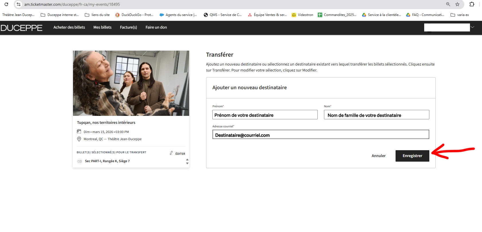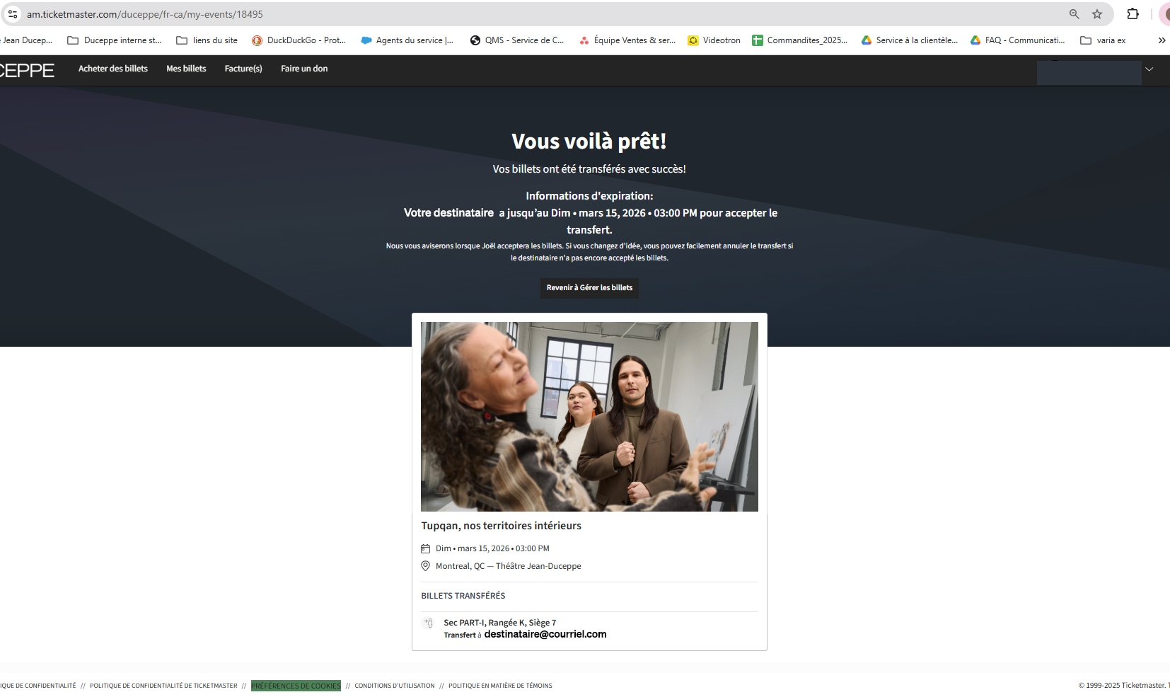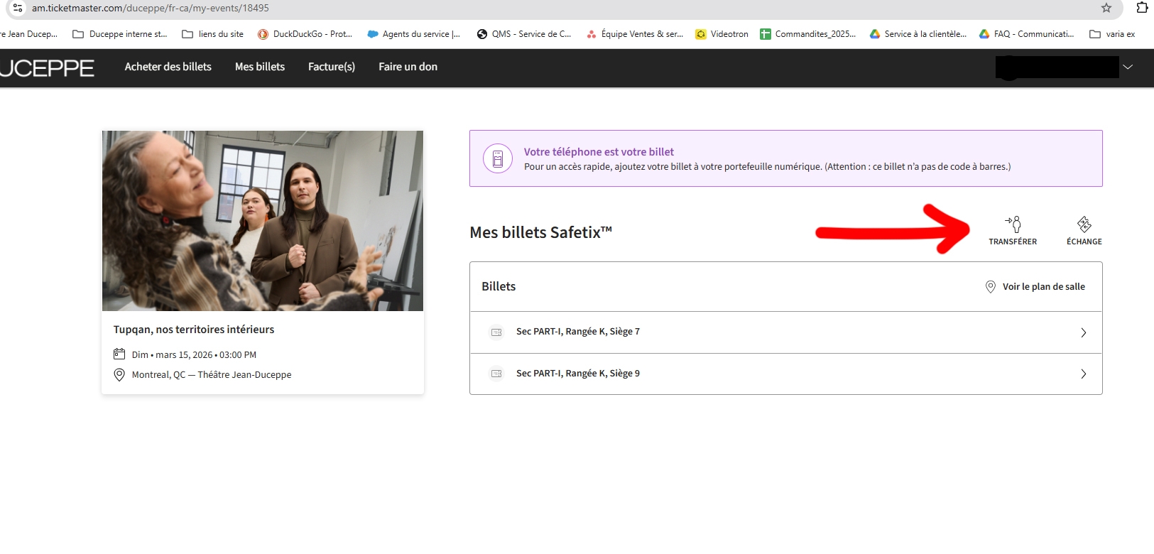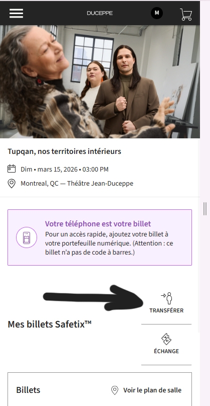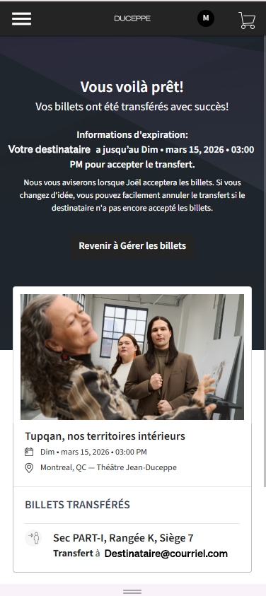 4 juin 2025La fonction «Transférer» sert uniquement à envoyer un billet à quelqu’un d’autre. Il s’agit de la façon la plus sûre d’envoyer ou de recevoir un billet pour un spectacle de Duceppe.