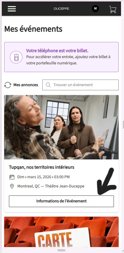 2. Sélectionnez l’événement à partir de la section «Mes billets». Récupérez vos billets en cliquant sur «Informations de l'événement»;