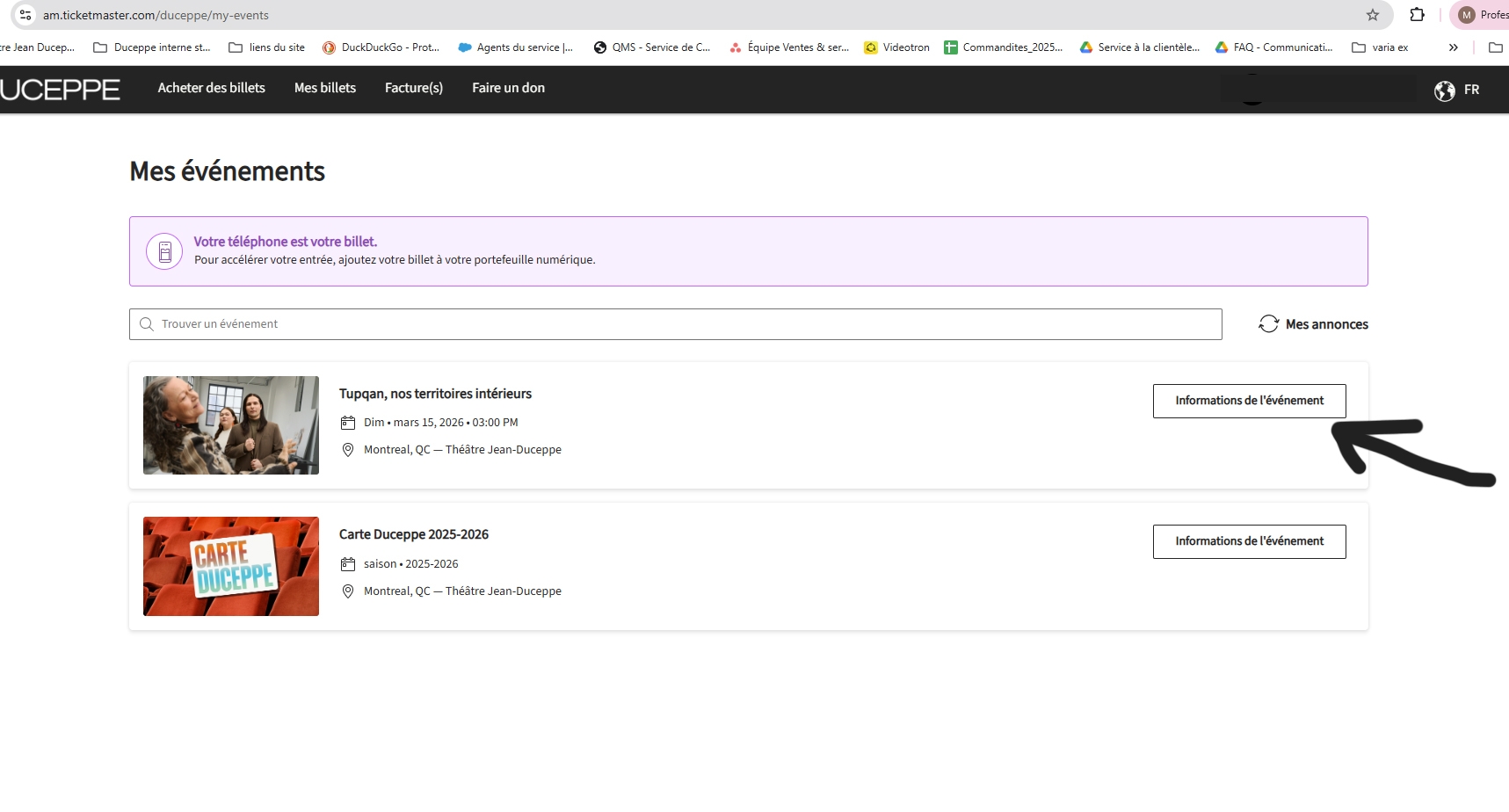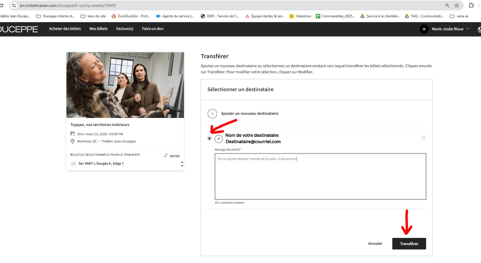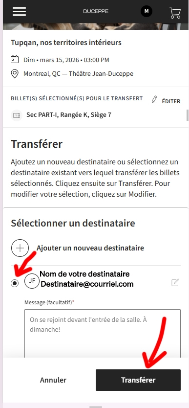 4 juin 2025La fonction «Transférer» sert uniquement à envoyer un billet à quelqu’un d’autre. Il s’agit de la façon la plus sûre d’envoyer ou de recevoir un billet pour un spectacle de Duceppe.
