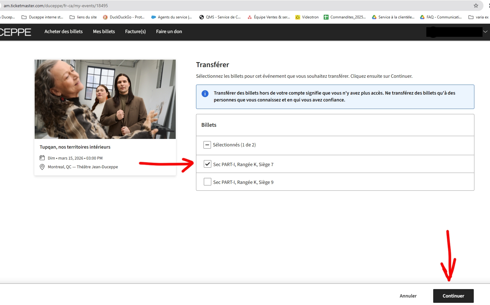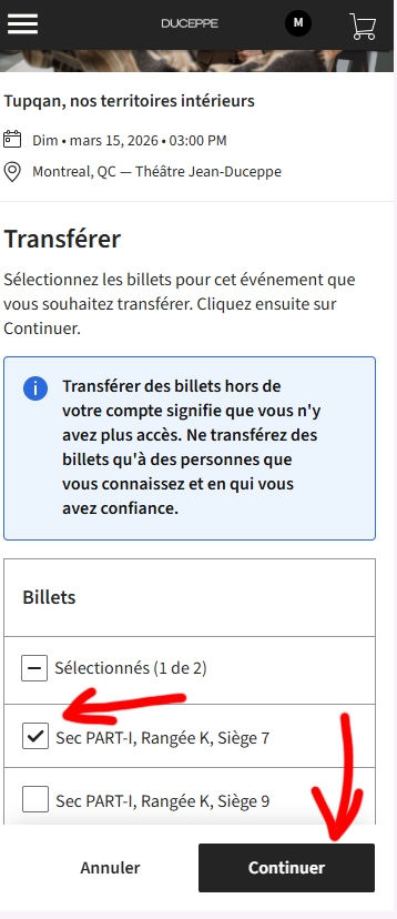 6. Sélectionnez le ou les billets que vous souhaitez transférer, puis cliquez sur «Continuer»;