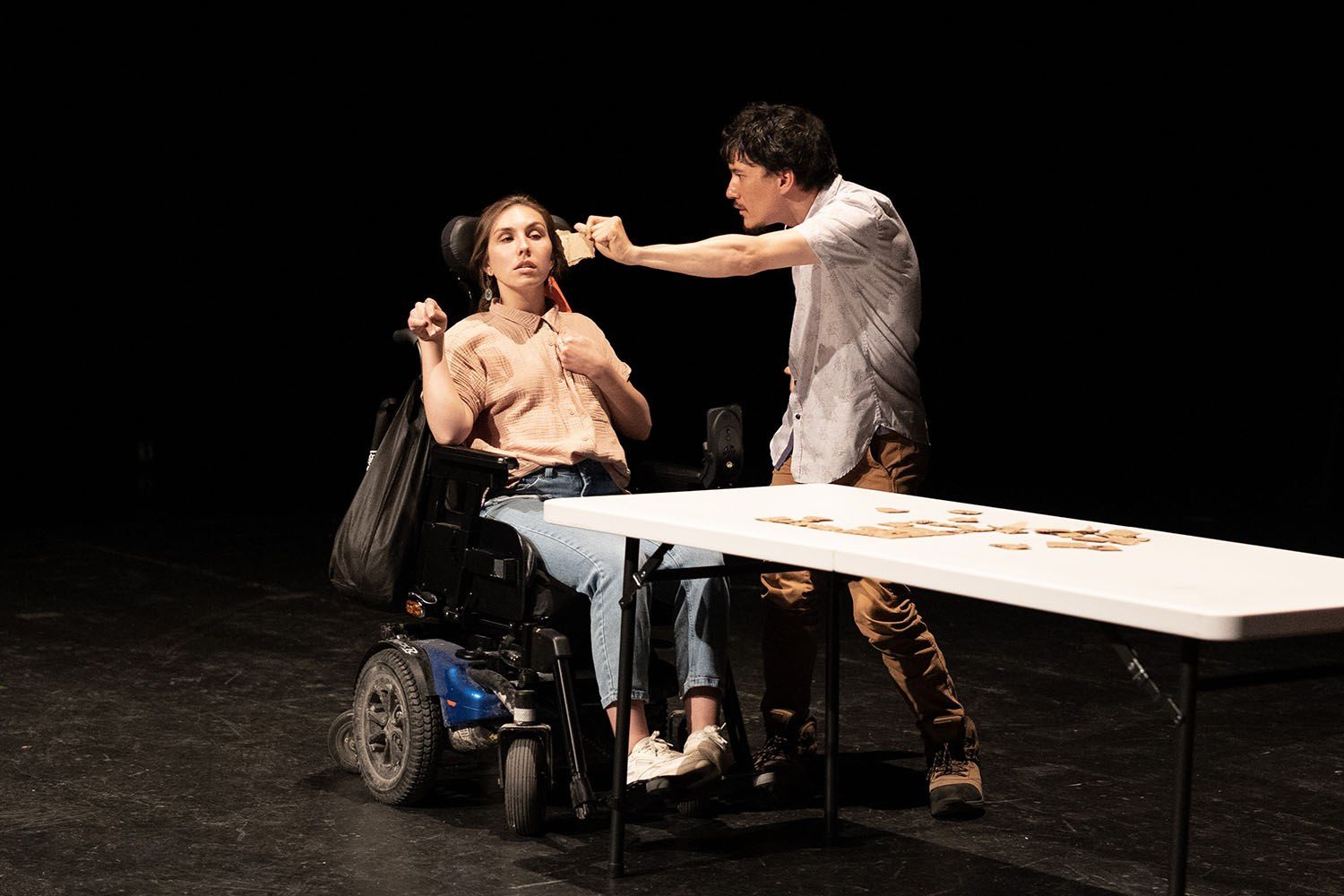 Quand le comédien et dramaturge Vincent Paquette nous a proposé Caroline, un projet de théâtre documentaire, nous avons tout de suite été frappés par son originalité et son humanité. La pièce est inspirée de l'histoire de sa cousine Caroline, quadraplégique et atteinte de paralysie cérébrale. Sans misérabilisme, Caroline aborde la réalité des adultes handicapé·es et de leurs proches au Québec. Nous sommes donc très heureux et fiers d’accueillir l’équipe de Caroline dans notre Centre de création pour un laboratoire au cours duquel le jeune créateur Vincent Paquette (qu’on a pu voir sur notre scène dans Royal en 2024 et qui incarne Malik dans Être ou ne pas être un douchebag, présenté en formule 5 à 7 au printemps 2025) collaborera avec le metteur en scène Alexandre Fecteau pour repenser la manière dont le théâtre documentaire peut toucher et sensibiliser le public. La distribution inclura également des personnes présentant divers handicaps pour approfondir le dialogue, faire entendre de nouvelles voix et incarner des parcours authentiques. - Nos codirecteurs artistiques David Laurin et Jean-Simon Traversy