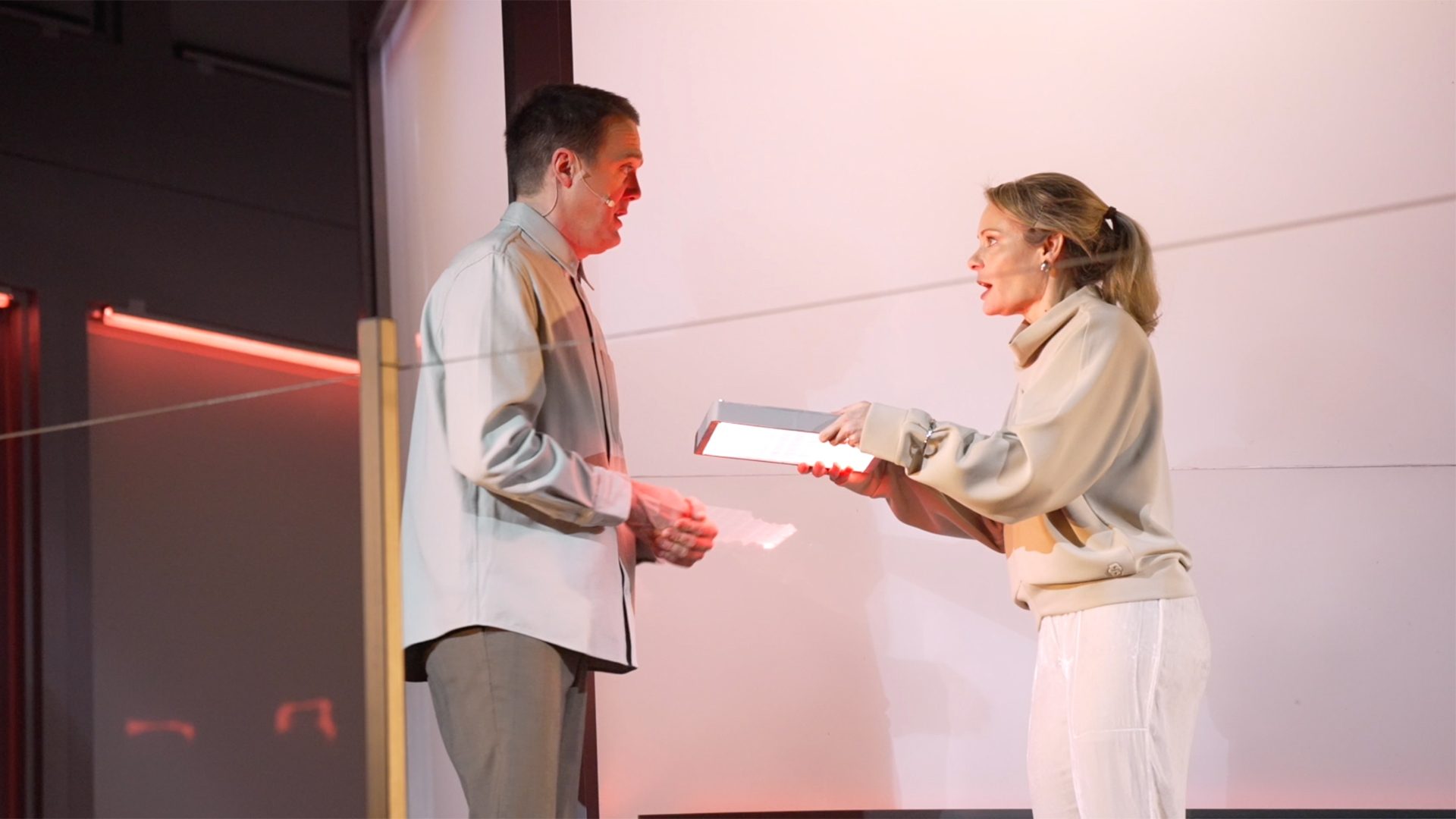 «La scénographie (Odile Gamache) est en parfaite symbiose avec le contenu. Ainsi, des éclairs de lumière, des flash de toutes sortes et des sons d’ordinateur traversent de part en part toute la pièce. Nous sommes bien les deux pieds dans un univers technologique»