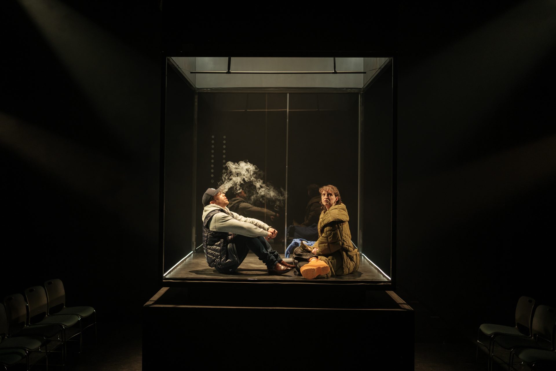Il aime faire du char et fumer des joints. Elle est sobre depuis 10 ans et trippe croissance personnelle. Il a à peine 30 ans, elle fête ses 40. Coincé·es ensemble dans un ascenseur de 1,5 mètre carré, Karine et Malik ne peuvent plus s’ignorer. Ni faire semblant de ne s’être jamais vu·es tout nu·es. Car ces deux êtres aux antipodes ont un passé commun, un vécu qu’il et elle revisiteront pour découvrir que leur vision de l’histoire n’est pas du tout la même. En cherchant divers moyens d’occuper le temps et de dissiper le malaise, les ex-amant·es tenteront de concilier l’inconciliable, en attendant impatiemment leur délivrance…